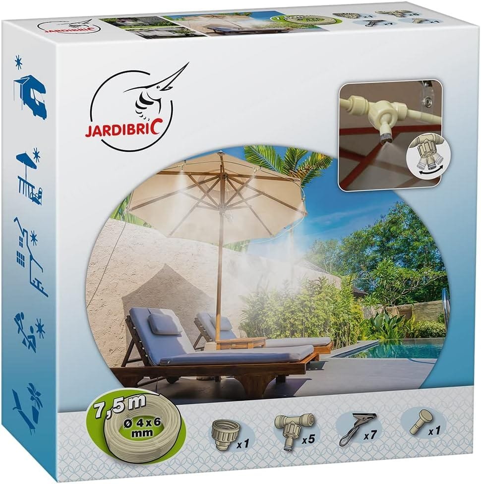 Este Kit de Nebulización Portátil Jardibric BRU051 es ideal para quienes buscan una solución económica y fácil de usar para mantener frescos sus espacios exteriores sin complicaciones.